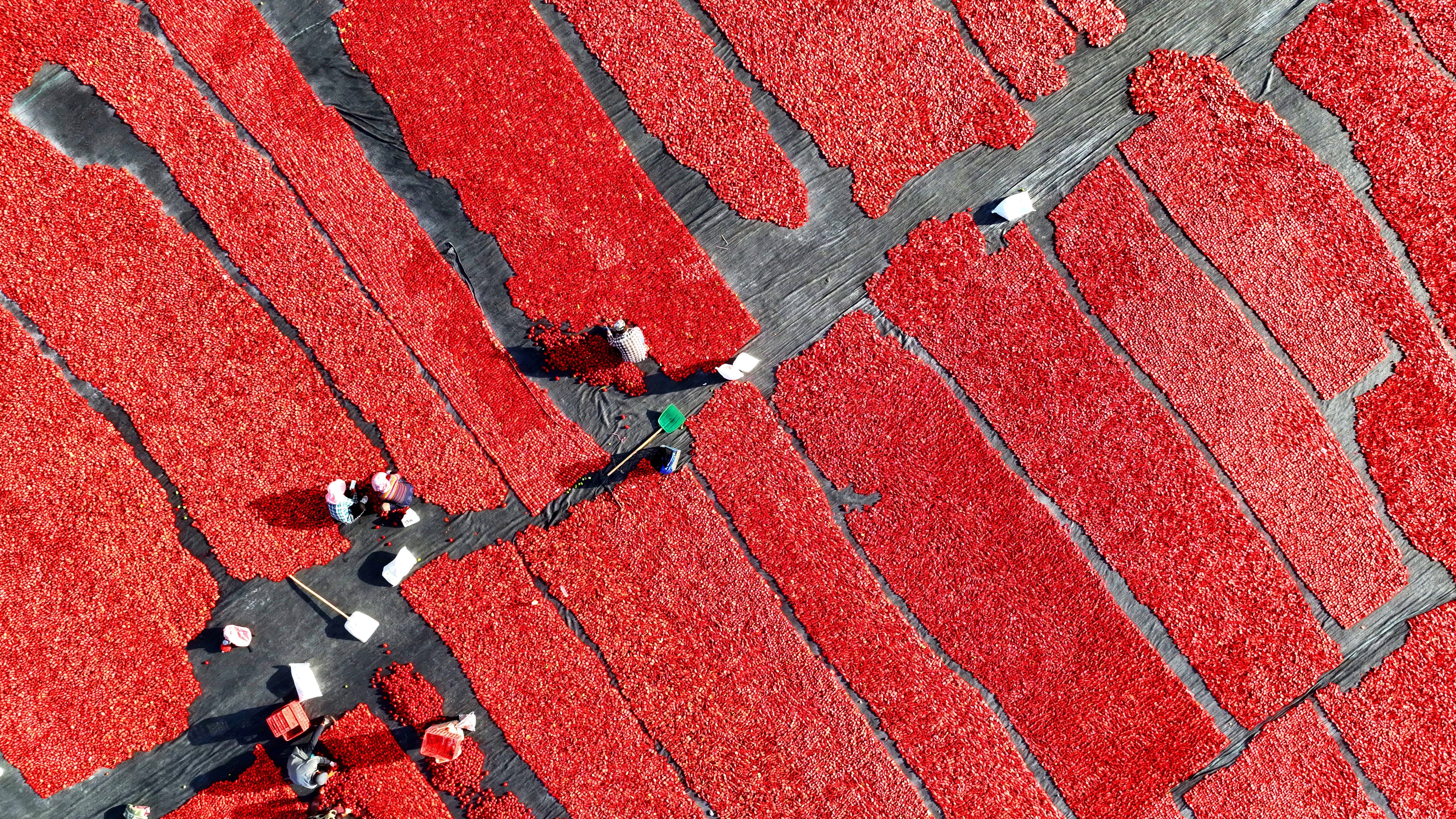 豐收了!新疆番茄晾曬忙 映紅戈壁灘