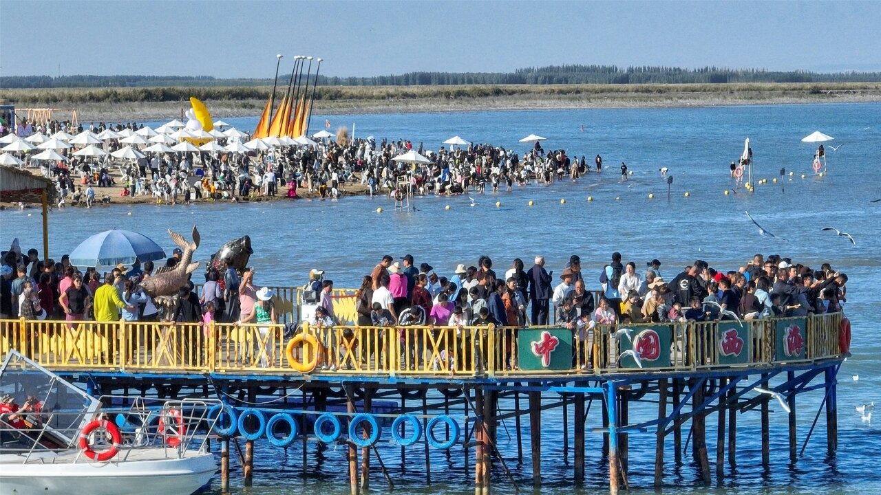 10月4日,游客在博湖縣境內(nèi)的博斯騰湖大河口景區(qū)體驗(yàn)娛樂項(xiàng)目。國慶中秋假期,博湖縣推出“文旅+生態(tài)”“文旅+民俗”系列活動(dòng),吸引各地游客紛至沓來。