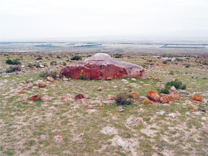 在東天山北麓巴里坤草原上,靜臥著一處規(guī)模宏大的古代游牧文化遺址——東黑溝遺址。該遺址是集墓葬、居址和巖畫(huà)于一體的超大型聚落,遺址的石筑高臺(tái)和石圍居住基址的年代可追溯至商代晚期至西周,而該遺址的墓葬年代主要集中在戰(zhàn)國(guó)晚期至西漢。2005年7月至9月,西北大學(xué)考古隊(duì)發(fā)現(xiàn)了以高臺(tái)為中心的遺存,并對(duì)相關(guān)遺跡進(jìn)行了初步測(cè)繪。