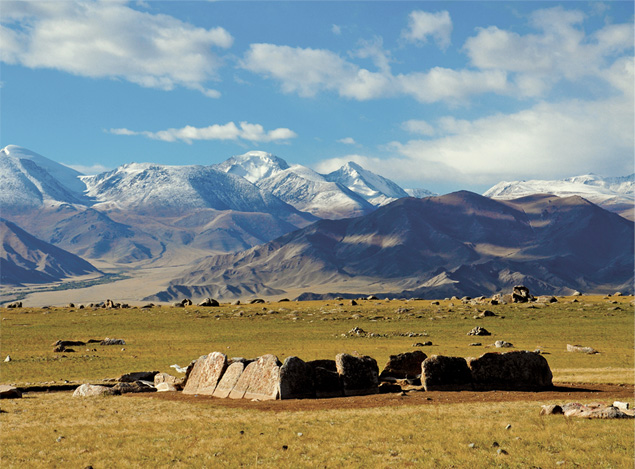 阿敦喬魯遺址與墓地是新疆早期青銅時(shí)代的代表性文化遺存,位于博爾塔拉蒙古自治州溫泉縣境內(nèi),從溫泉縣向西沿博爾塔拉河谷前行40多公里,就到了阿拉套山南麓的淺山地帶。這里巨石遍布,從山坡底部延至山頂,數(shù)量眾多,形態(tài)各異,仿佛石頭迷宮,遠(yuǎn)遠(yuǎn)望去好似一群奔騰的駿馬,當(dāng)?shù)厝朔Q(chēng)其為“阿敦喬魯”(蒙古語(yǔ),意為“像馬群一樣的石頭”)。