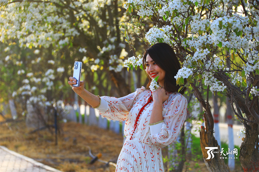 4月2日,游客在托克遜縣白楊河畔梨花下自拍。