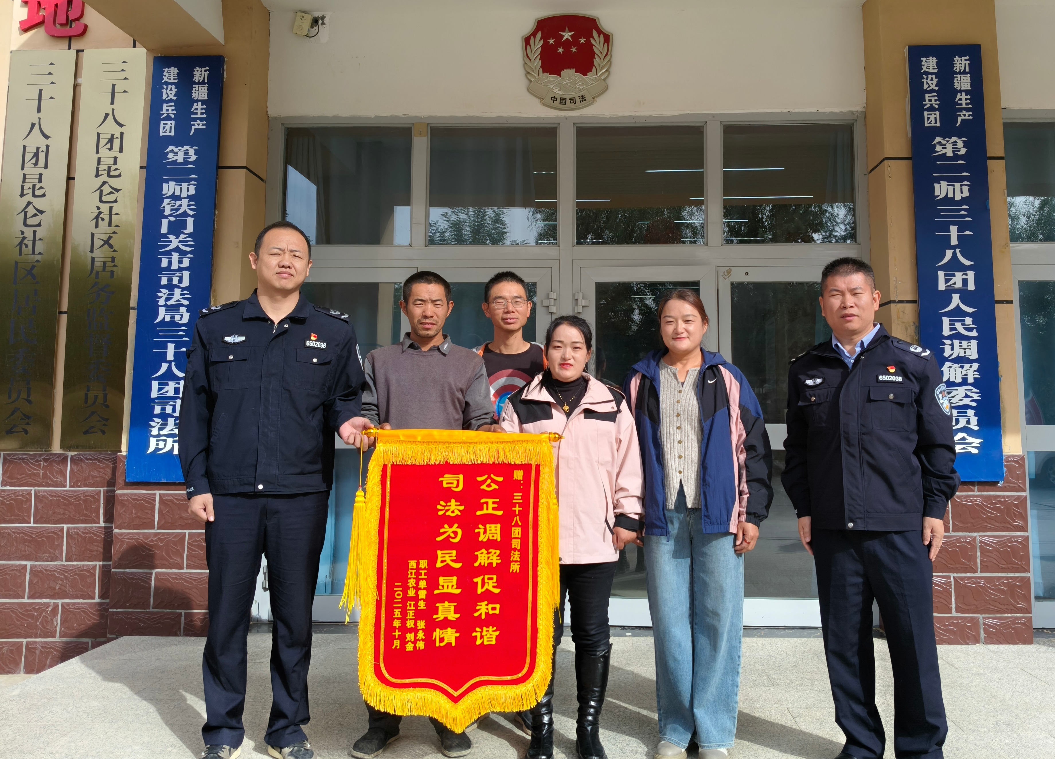 國慶、中秋假期后的首個工作日,兵團(tuán)第二師鐵門關(guān)市司法局三十八團(tuán)司法所就收到了5名職工代表送來的錦旗,印著“公正調(diào)解促和諧 司法為民顯真情”。