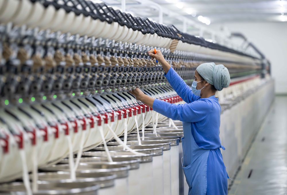 一名中方員工在中塔合作項(xiàng)目丹加拉農(nóng)業(yè)紡織產(chǎn)業(yè)園的紡紗二車間工作。