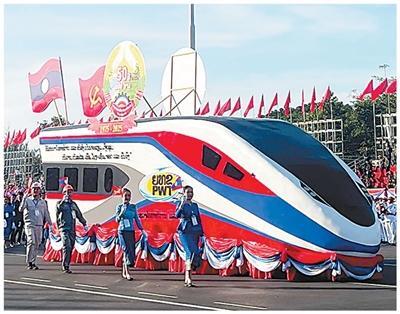 12月2日,以中老鐵路“瀾滄號”動車組車頭為造型的花車亮相老撾建國50周年慶祝活動。米巴薩攝