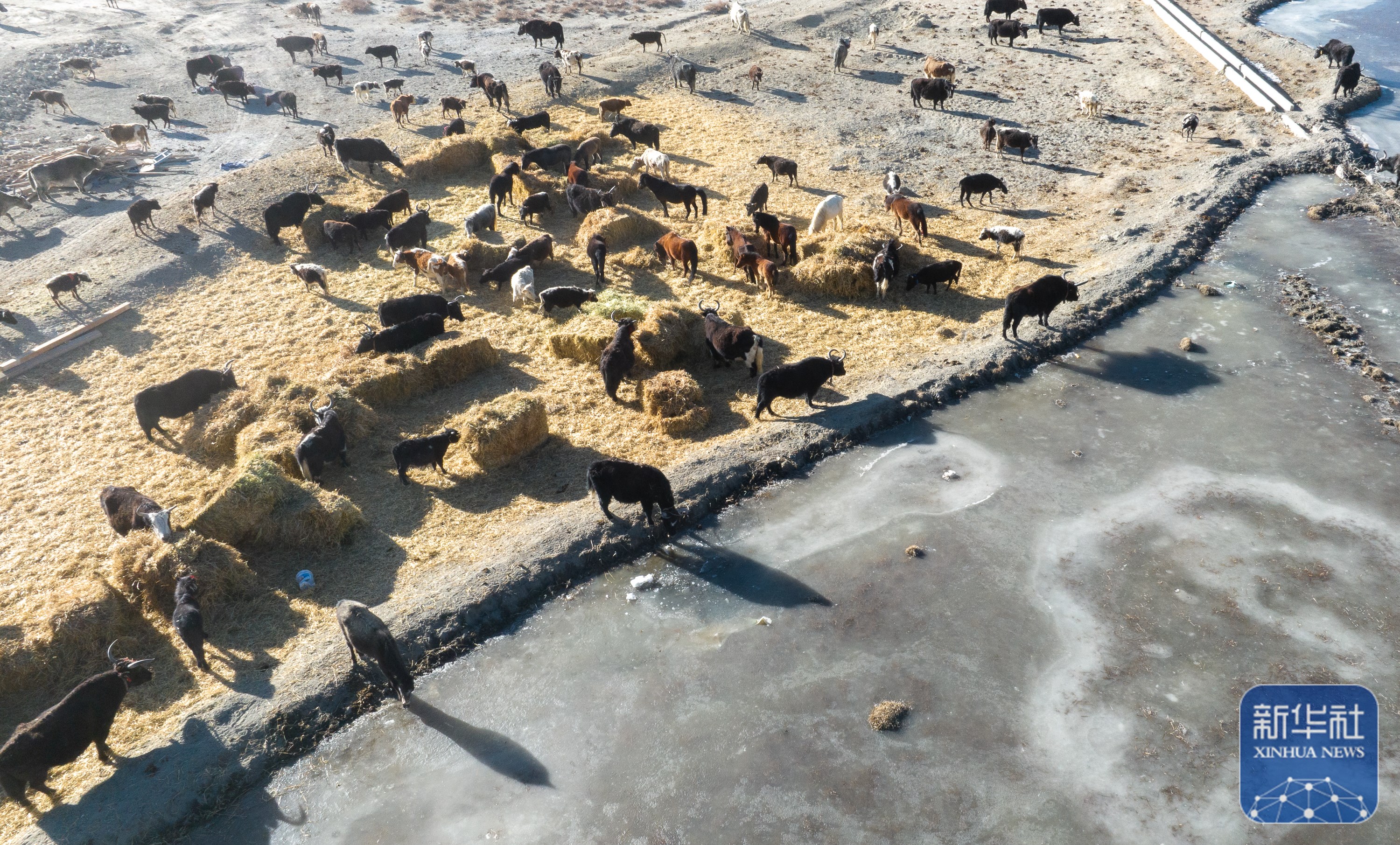 在定日縣長所鄉(xiāng)嘎布村,牛在吃草料(1月15日攝,無人機照片)。新華社記者 丁增尼達 攝