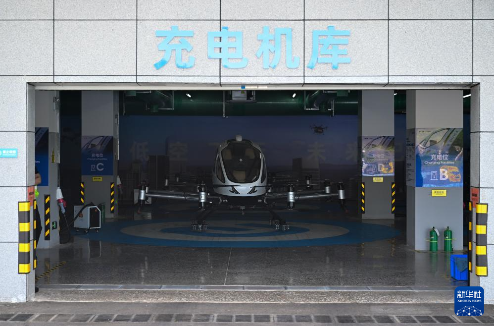 7月2日,在合肥駱崗公園,一架電動垂直起降飛行器(eVTOL)停放在充電機(jī)庫中。新華社記者 周牧 攝