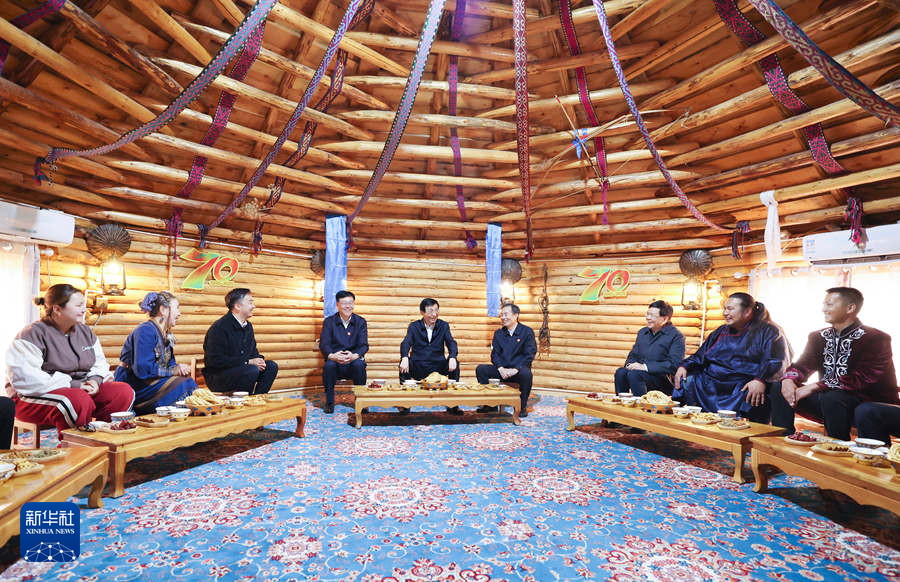 9月27日,受習(xí)近平總書(shū)記囑托,中共中央政治局常委、全國(guó)政協(xié)主席、中央代表團(tuán)團(tuán)長(zhǎng)王滬寧帶領(lǐng)中央代表團(tuán)部分成員到阿勒泰地區(qū)布爾津縣考察。這是王滬寧和中央代表團(tuán)部分成員在扎拉特鄉(xiāng)村旅游專(zhuān)業(yè)合作社同村民交流。新華社記者 姚大偉 攝