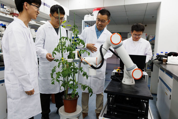 2025年8月12日,在中國(guó)科學(xué)院遺傳與發(fā)育生物學(xué)研究所實(shí)驗(yàn)室,許操研究員(右二)和團(tuán)隊(duì)成員在調(diào)試智能育種機(jī)器人“吉兒”。新華社記者 金立旺 攝
