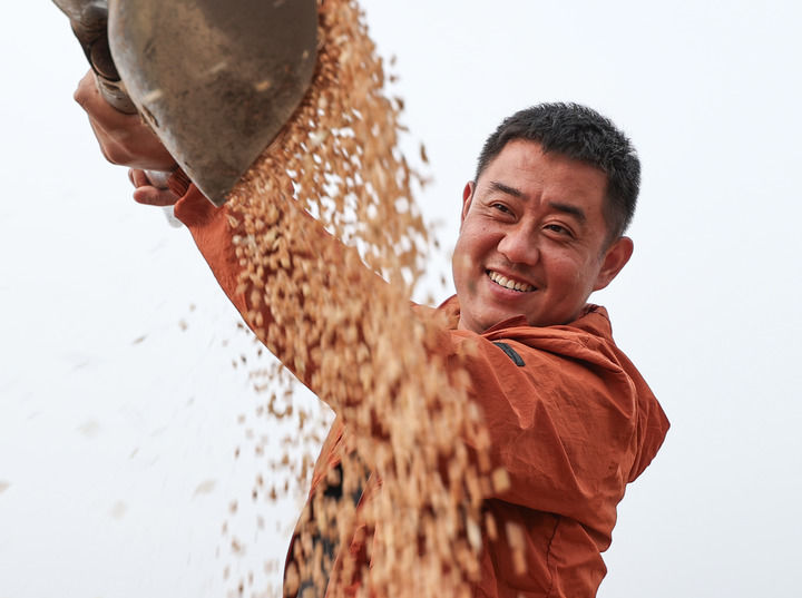 2025年5月27日,江蘇省淮安市盱眙縣種糧大戶劉凱在田間查看收獲的小麥。這批小麥選用淮安市農(nóng)科院選育的良種“淮麥60”。新華社發(fā)(許昌銀攝)