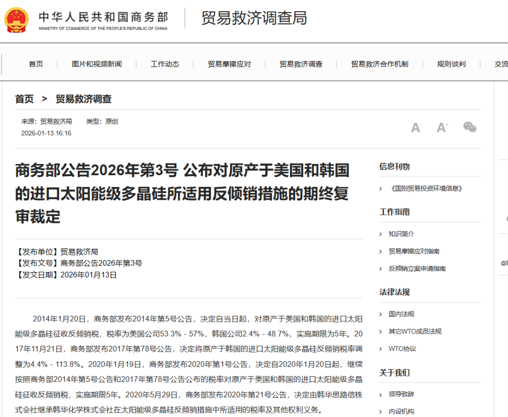 2014年1月20日,商務(wù)部發(fā)布2014年第5號公告,決定自當(dāng)日起,對原產(chǎn)于美國和韓國的進(jìn)口太陽能級多晶硅征收反傾銷稅,稅率為美國公司53.3%-57%,韓國公司2.4%-48.7%,實(shí)施期限為5年。2017年11月21日,商務(wù)部發(fā)布2017年第78號公告,決定將原產(chǎn)于韓國的進(jìn)口太陽能級多晶硅反傾銷稅率調(diào)整為4.4%-113.8%。2020年1月19日,商務(wù)部發(fā)布2020年第1號公告,決定自2020年1月20日起,繼續(xù)按照商務(wù)部2014年第5號公告和2017年第78號公告公布的稅率對原產(chǎn)于美國和韓國的進(jìn)口太陽能級多晶硅征收反傾銷稅,實(shí)施期限5年。2020年5月29日,商務(wù)部發(fā)布2020年第21號公告,決定由韓華思路信株式會社繼承韓華化學(xué)株式會社在太陽能級多晶硅反傾銷措施中所適用的稅率及其他權(quán)利義務(wù)。
