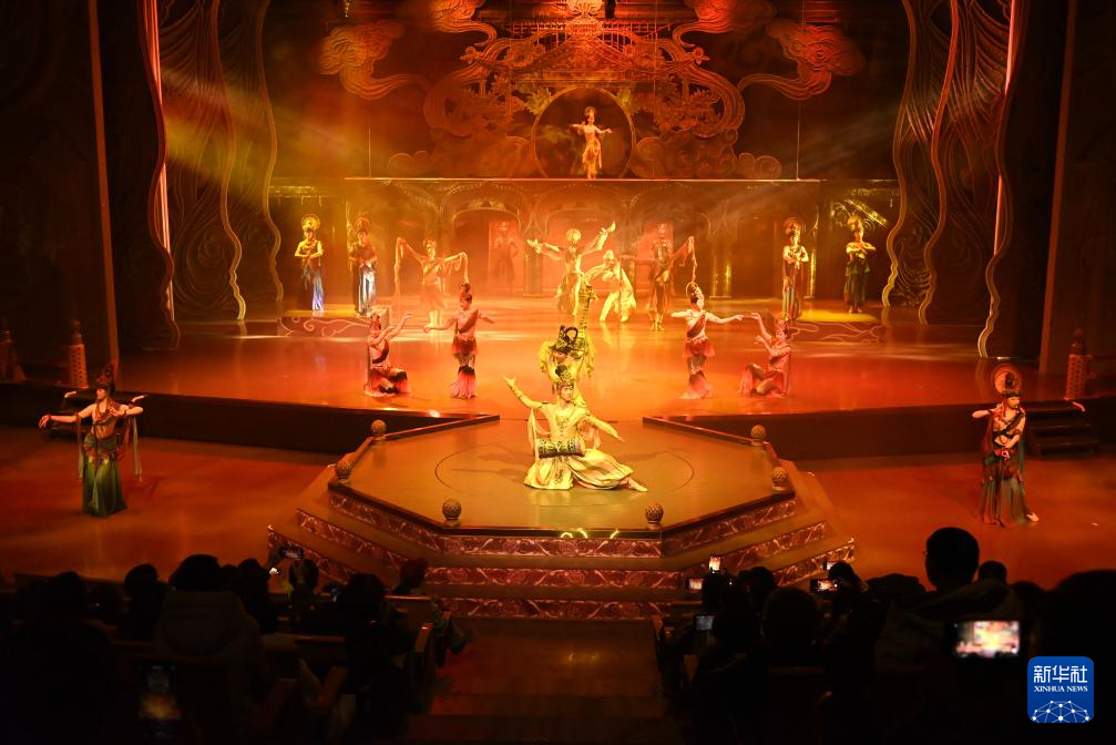 1月9日晚,游客觀看大型洞窟沉浸式體驗(yàn)劇《樂動(dòng)敦煌》。新華社發(fā)(張曉亮 攝)