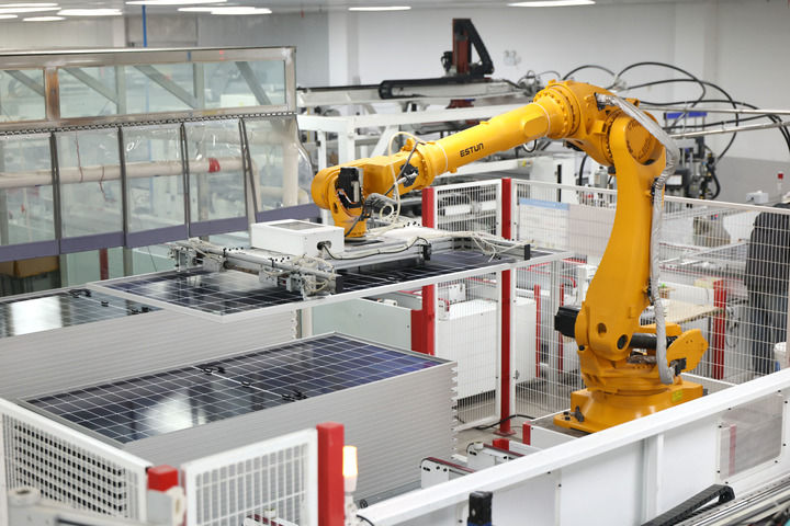 在江蘇省淮安市洪澤區(qū)新源太陽(yáng)能科技有限公司生產(chǎn)車間內(nèi),工業(yè)機(jī)器人在生產(chǎn)太陽(yáng)能光伏組件(2025年12月17日攝)。新華社發(fā)(殷潮 攝)