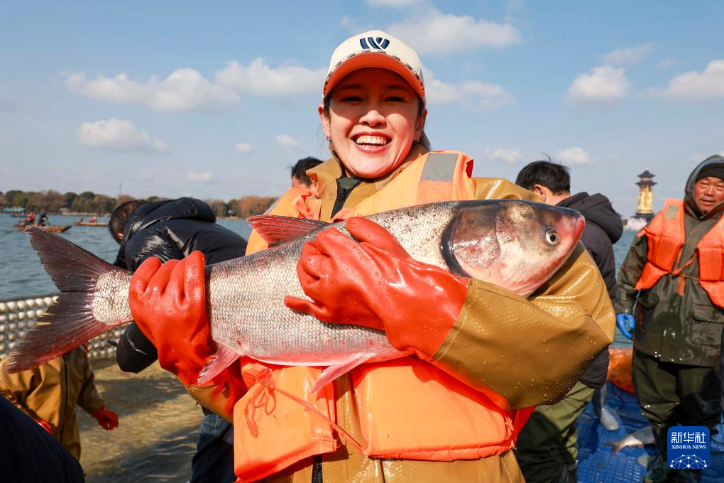 1月31日,在2026溱湖灣冬捕活動現(xiàn)場,市民展示自己參與捕魚游戲捕獲的大魚。新華社發(fā)(顧繼紅攝)