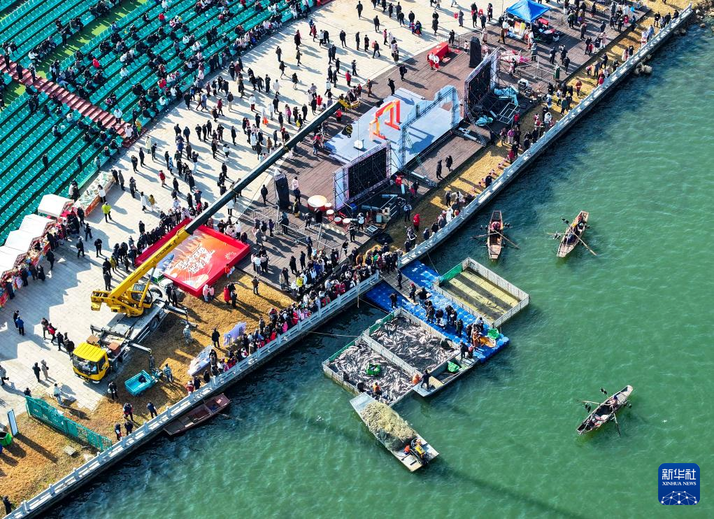 1月31日,游客和漁民在2026溱湖灣冬捕活動現(xiàn)場互動(無人機(jī)照片)。新華社發(fā)(湯德宏攝)