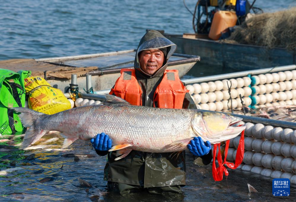 1月31日,漁民在2026溱湖灣冬捕活動現(xiàn)場展示捕獲的大魚。新華社發(fā)(顧繼紅攝)