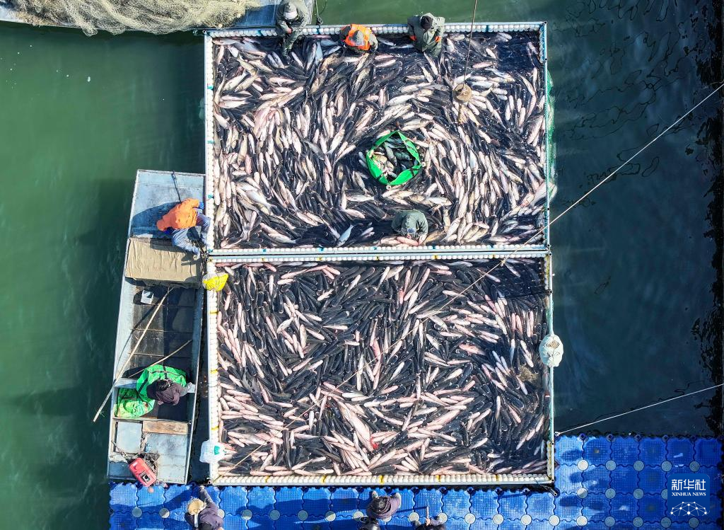 1月31日,漁民在泰州市姜堰區(qū)溱湖灣進(jìn)行冬捕作業(yè)(無人機(jī)照片)。新華社發(fā)(顧繼紅攝)