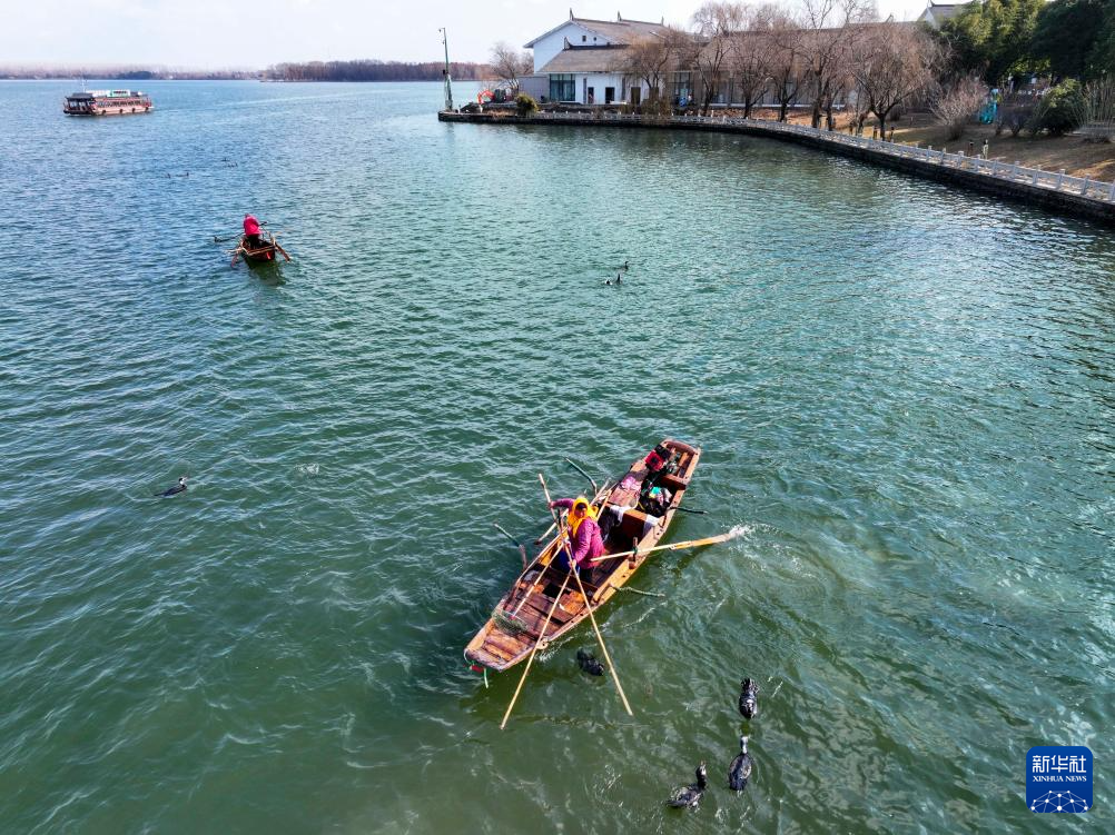 1月31日,漁民在泰州市姜堰區(qū)溱湖灣用鸕鶿進(jìn)行捕魚(無人機(jī)照片)。新華社發(fā)(顧繼紅攝)