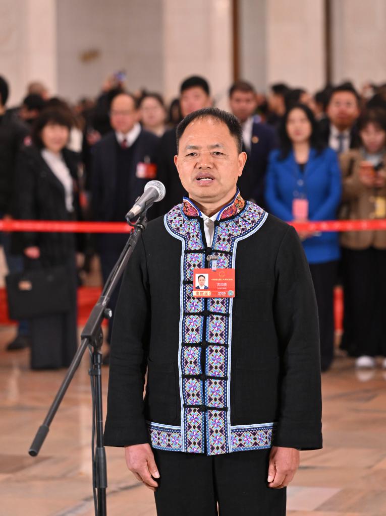 3月5日,第十四屆全國人民代表大會第四次會議首場“代表通道”集中采訪活動在北京人民大會堂舉行。這是全國人大代表農(nóng)加貴接受媒體采訪。新華社記者 李鑫 攝