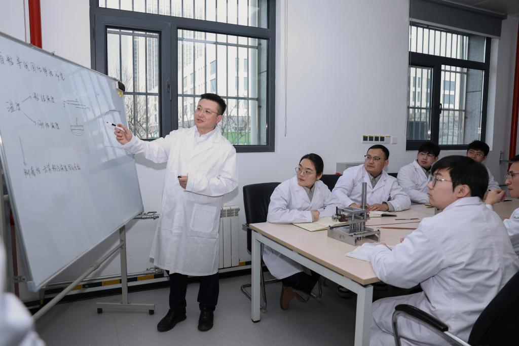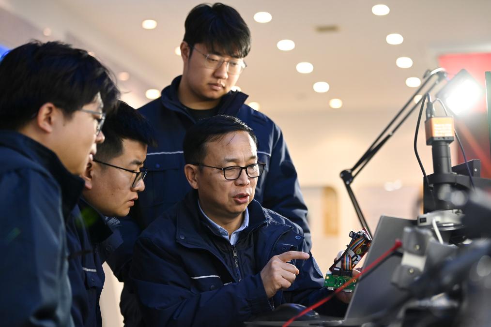 2月13日,在位于山東濟(jì)南的山東電工電氣設(shè)備公司工藝實驗室,全國人大代表、中國電氣裝備集團(tuán)副總經(jīng)理張帆(左一)主持自粘導(dǎo)線固化特性實驗方案討論。新華社發(fā)(中國電氣裝備集團(tuán)供圖)