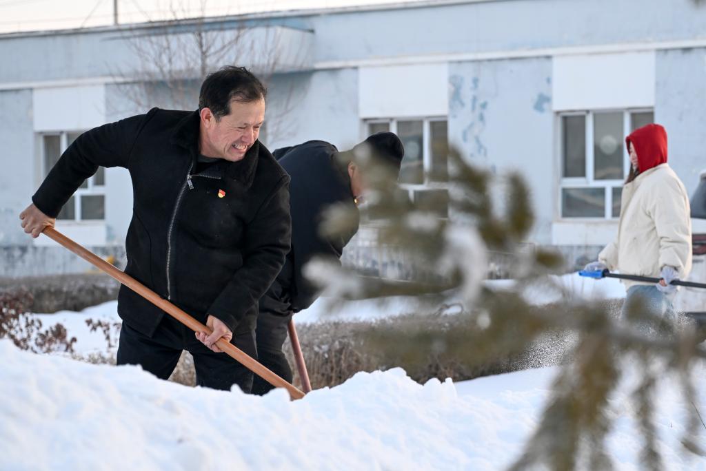 2月9日,在新疆伊犁哈薩克自治州新源縣,全國人大代表木沙江·海拉特(前)在克熱格塔斯村黨群服務(wù)中心和當(dāng)?shù)馗刹恳黄鹎謇矸e雪。新華社記者 王菲 攝
