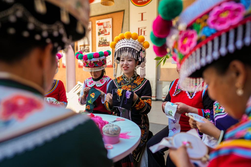 2月9日,在云南楚雄彝族自治州牟定縣,全國人大代表金瑞瑞在自己的工作室內(nèi)和繡娘們刺繡、談心。新華社記者 陳欣波 攝