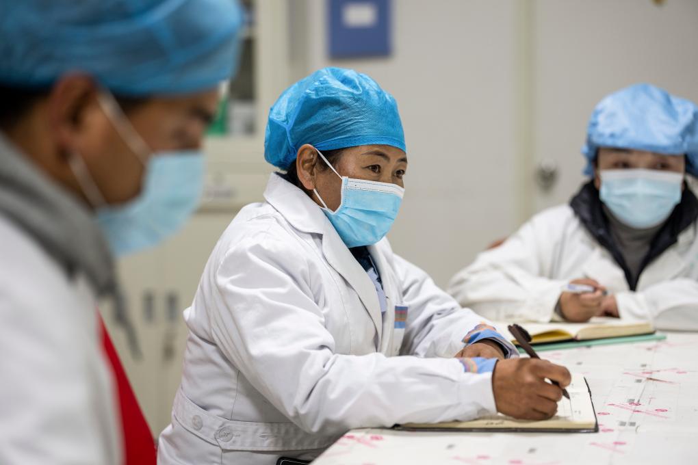 2月11日,在西藏拉薩,全國人大代表次仁措姆在西藏甘露藏醫(yī)藥產(chǎn)業(yè)集團(tuán)有限公司生產(chǎn)車間調(diào)研。新華社記者 旦增尼瑪曲珠 攝