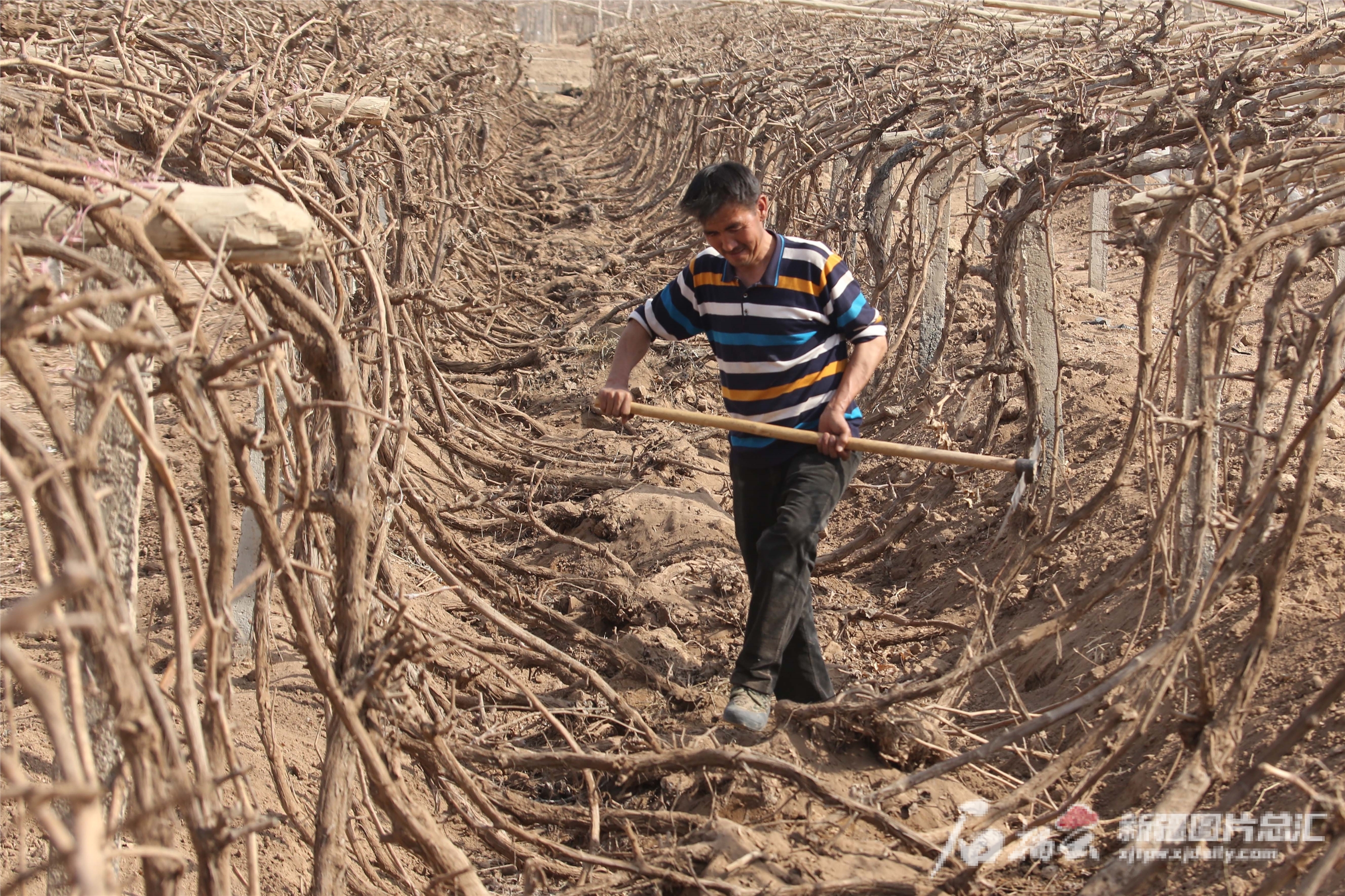 2022年3月11日,在鄯善縣吐峪溝鄉(xiāng)堿灘坎村葡萄園,果農(nóng)正在為葡萄開墩上架。天山網(wǎng)-新疆日報記者蔡增樂 攝