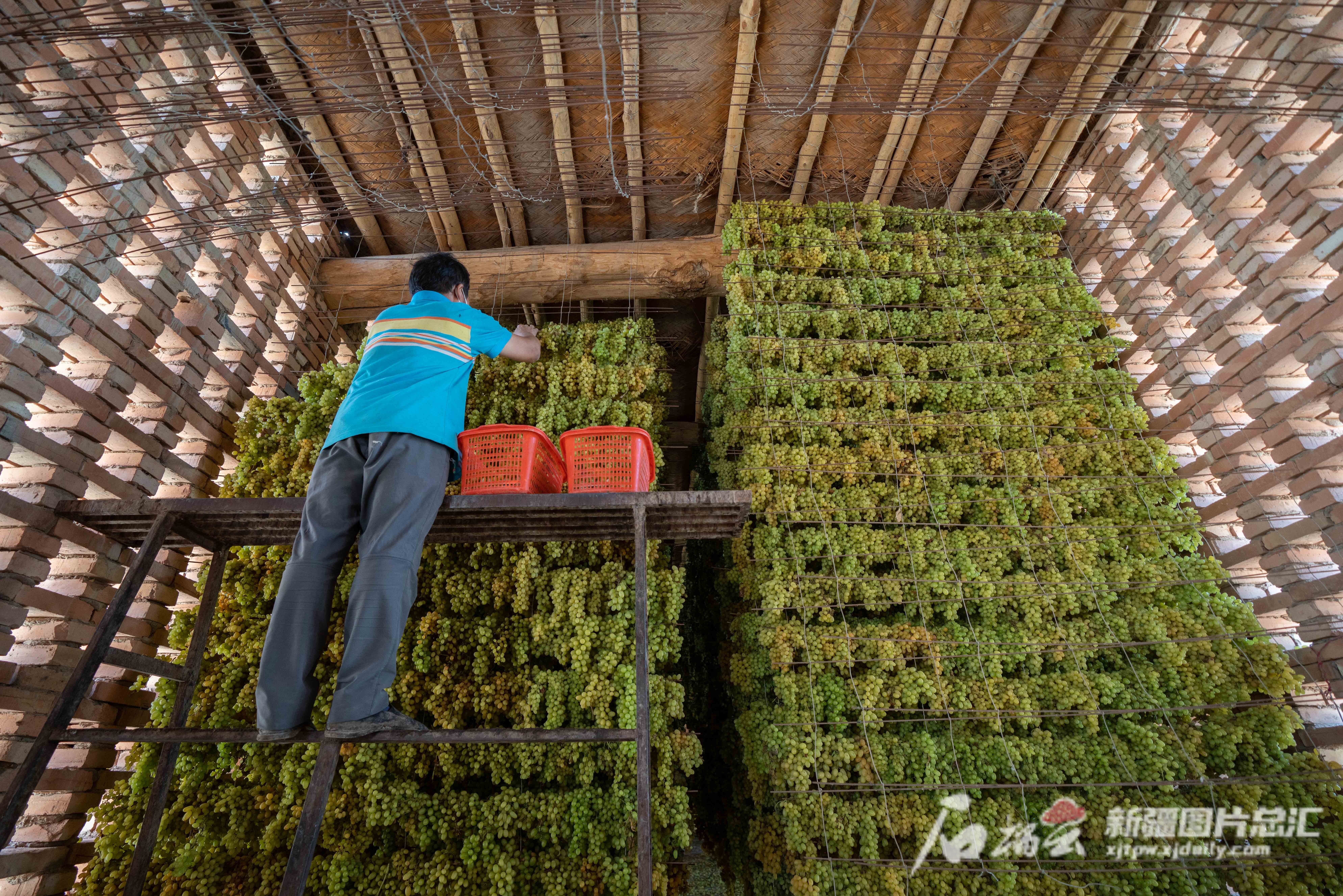 2022年9月25日,吐魯番市高昌區(qū)恰特喀勒鄉(xiāng)奧依曼坎爾孜村,村民正忙著將葡萄掛上晾房支架。天山網(wǎng)-新疆日報記者呂伊晗 攝