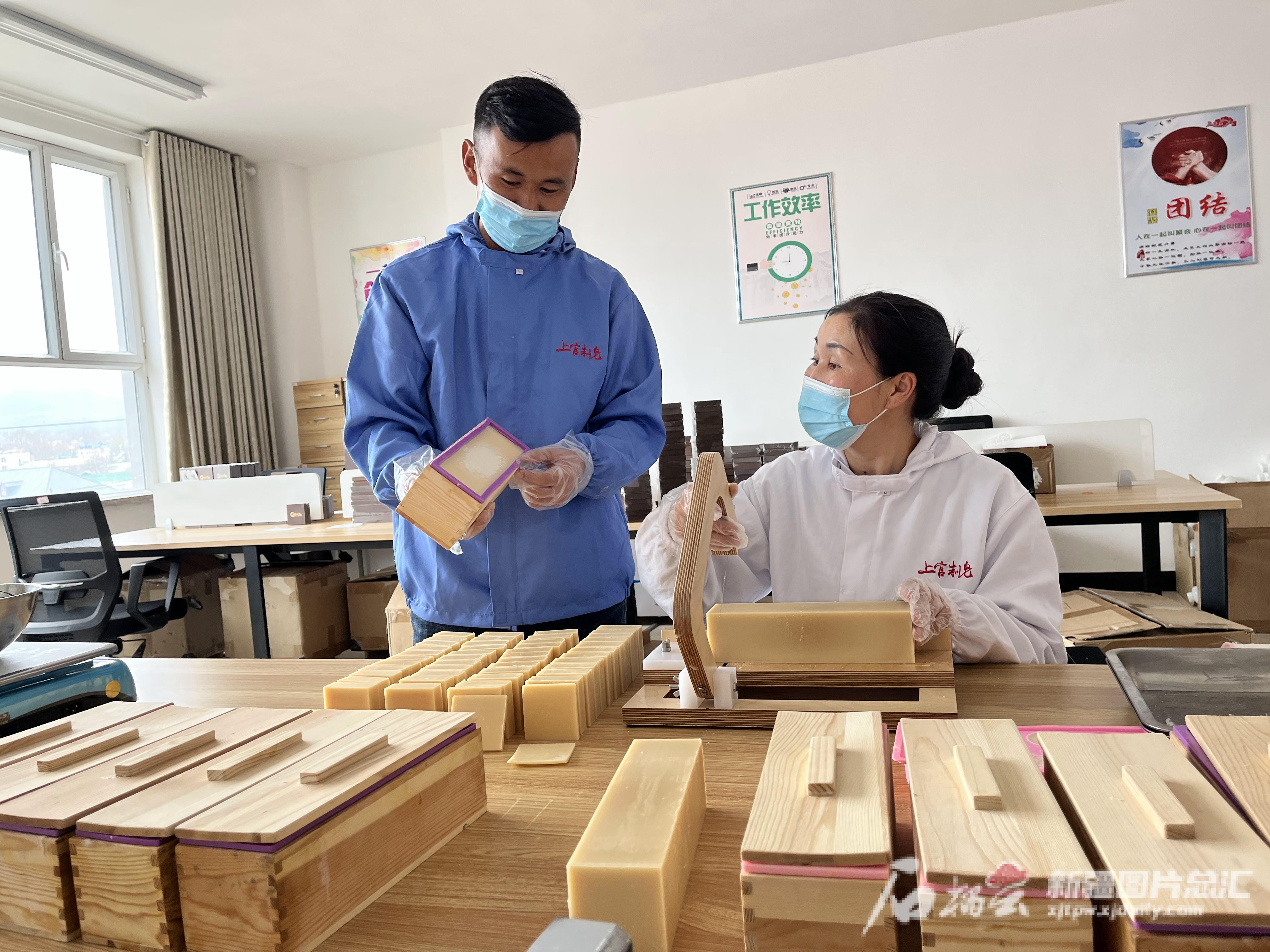 新疆牧馬人生物科技有限公司總經(jīng)理哈斯葉爾登(左)和員工研究手工馬油香皂制造工藝。天山網(wǎng)-新疆日?qǐng)?bào)記者 巴莎·鐵格斯 攝