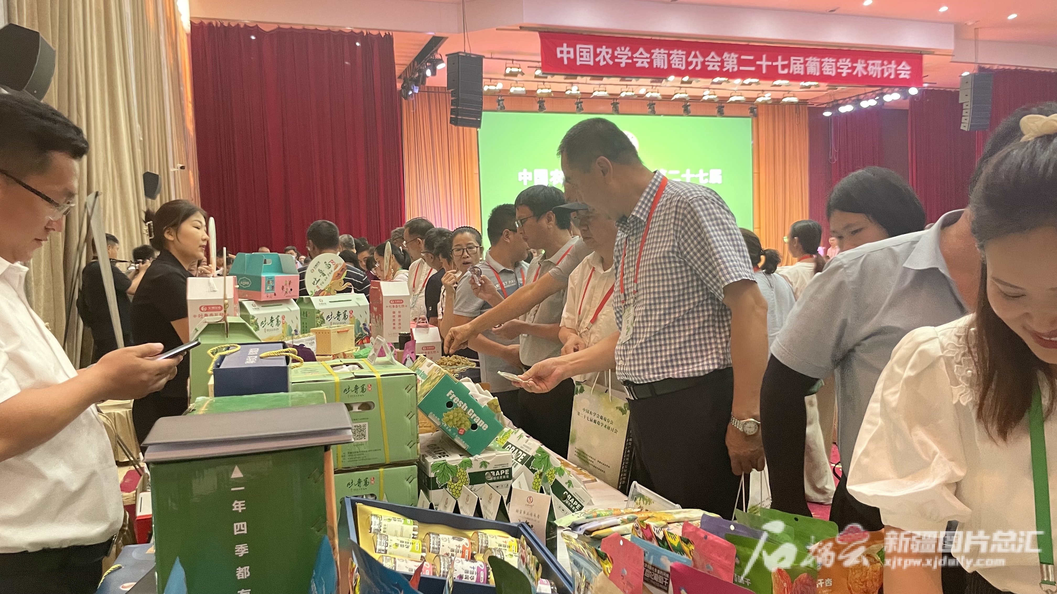 7月14日,中國農(nóng)學會葡萄分會第二十七屆葡萄學術研討會現(xiàn)場,參會人員參觀會場的特色農(nóng)產(chǎn)品展銷區(qū)。天山網(wǎng)-新疆日報記者 張瑞麟 攝