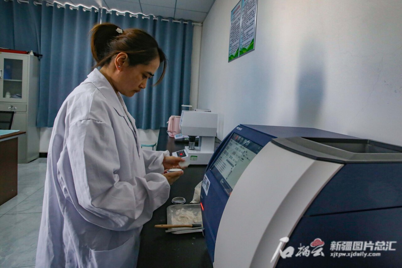 7月21日,檢測(cè)人員在新疆豐驛農(nóng)業(yè)發(fā)展有限公司檢驗(yàn)室抽檢剛下線的面粉。