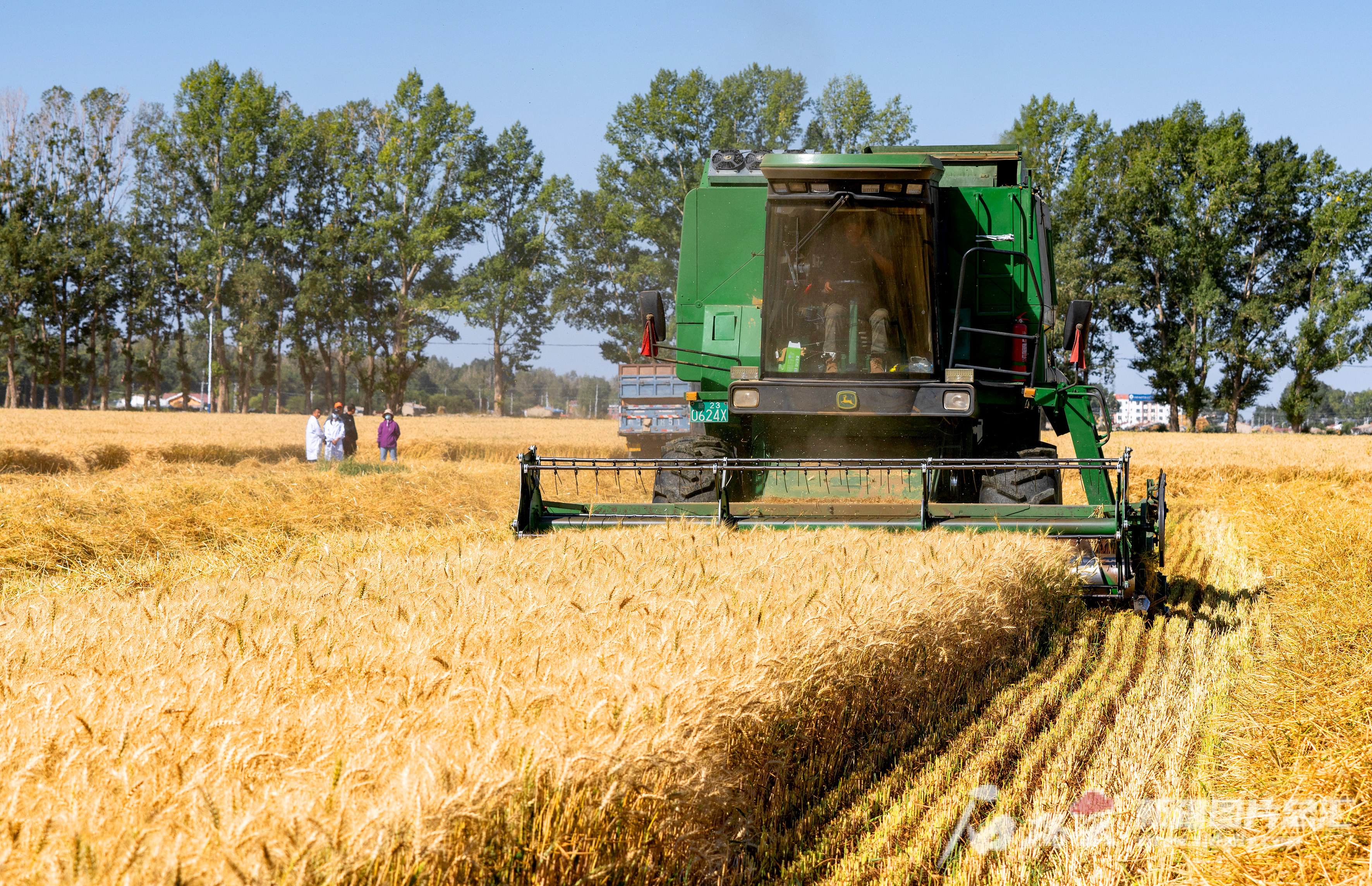 9月11日,收割機在巴里坤哈薩克自治縣花園鄉(xiāng)南園子村“新春48號”春小麥高產(chǎn)示范田收割小麥。李華 攝