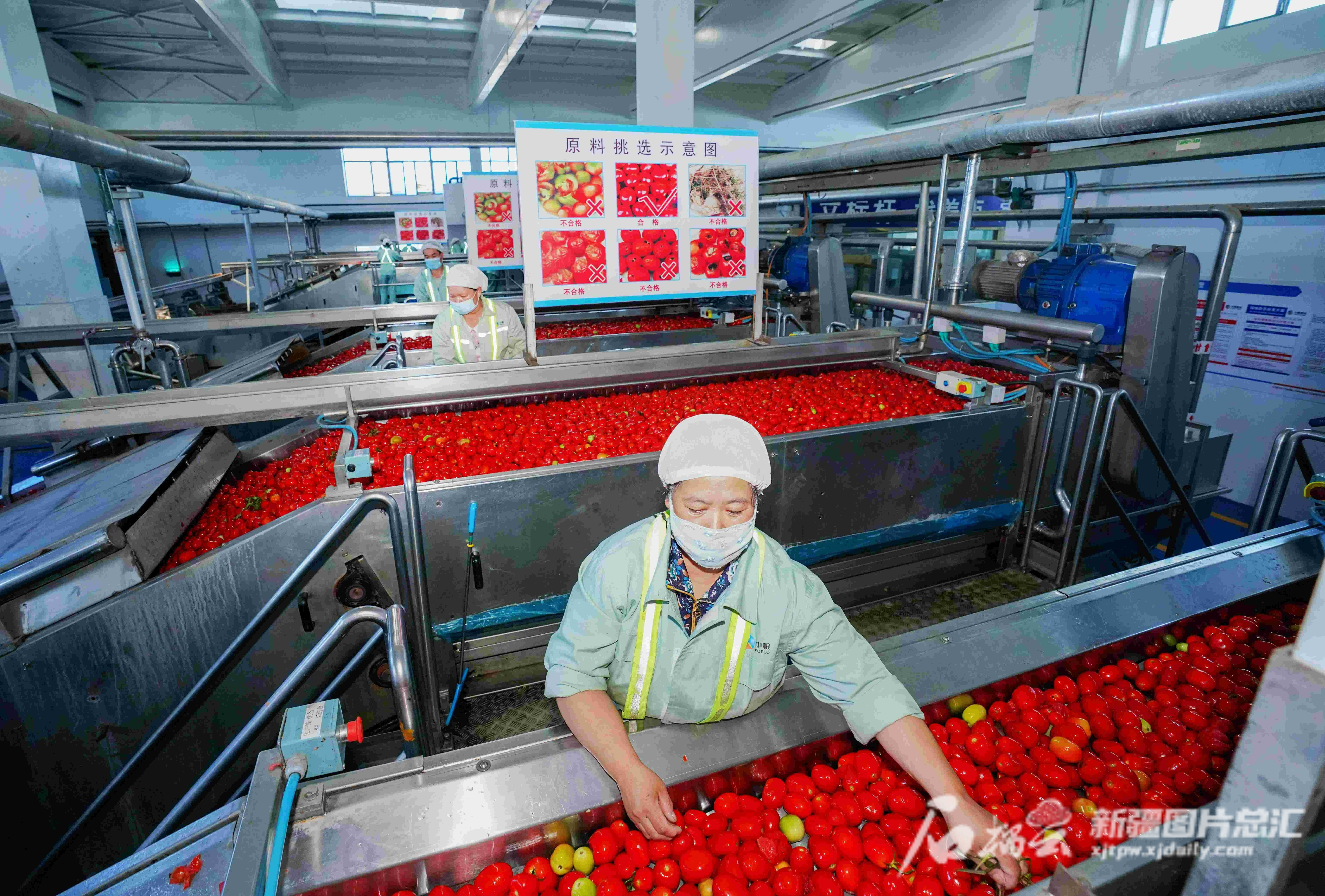 9月10日,在中糧屯河昌吉番茄制品有限公司生產(chǎn)車間里,工人在對(duì)番茄進(jìn)行挑揀。何龍攝