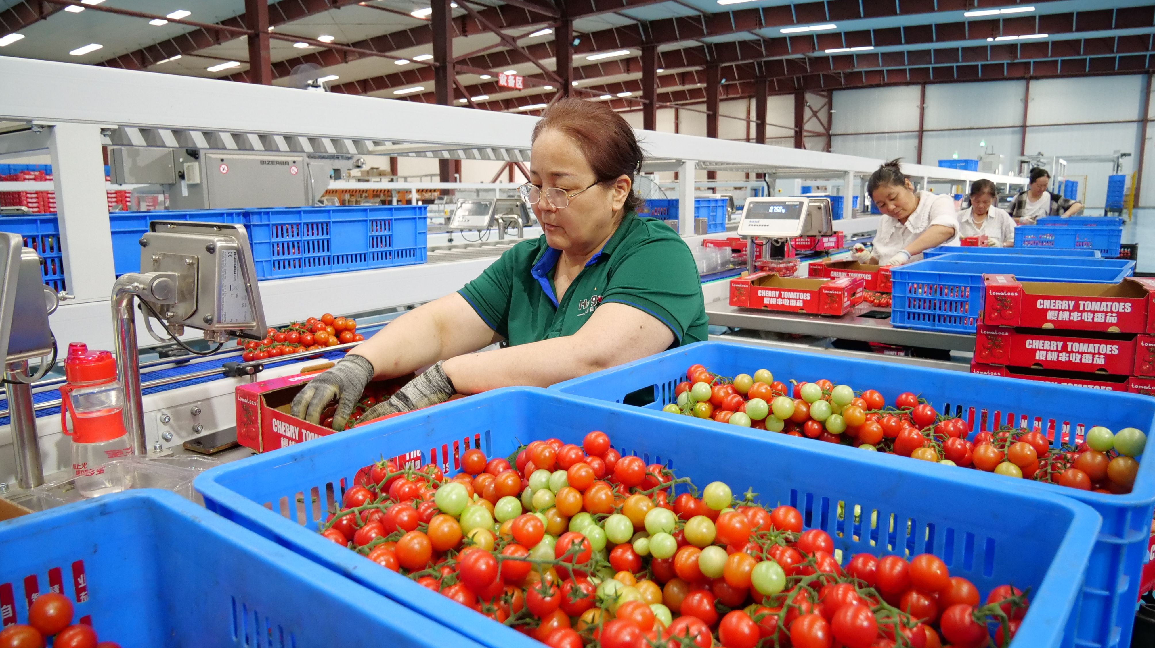 9月20日,在霍爾果斯南部產(chǎn)業(yè)園區(qū)現(xiàn)代農(nóng)業(yè)科技產(chǎn)業(yè)園,一株株番茄整齊排列,葉面碩大鮮綠,果實(shí)晶瑩剔透,工人們穿梭其中,忙著采摘、分揀、裝箱。