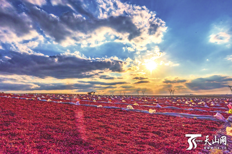 9月15日,沙灣市安集海鎮(zhèn),農(nóng)民在晾曬辣椒。金秋時(shí)節(jié),被譽(yù)為“辣椒之鄉(xiāng)”的安集海鎮(zhèn)處處都是紅彤彤的辣椒,一派豐收景象。 田國(guó)建攝
