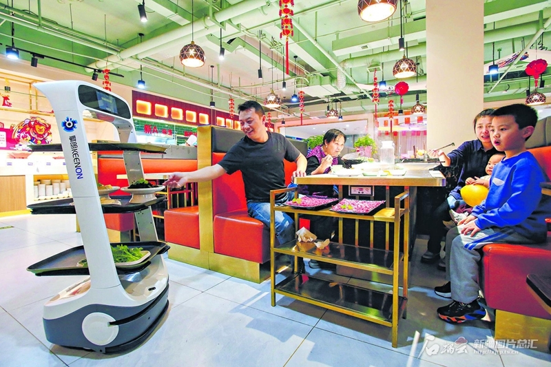 3月17日,位于烏魯木齊市水磨溝區(qū)溫泉西路的一家火鍋店,工作人員將菜品放在機(jī)器人的餐盤上,按下顧客所在桌號(hào),機(jī)器人就將飯菜送達(dá)指定餐桌:“您的菜品已送達(dá),請(qǐng)取餐。”天山網(wǎng)-新疆日?qǐng)?bào)記者蔡增樂攝