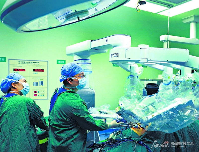 3月18日,在阿克蘇地區(qū)第一人民醫(yī)院手術(shù)室,醫(yī)生操作微創(chuàng)機(jī)器人為患者做手術(shù)。楊碩攝
