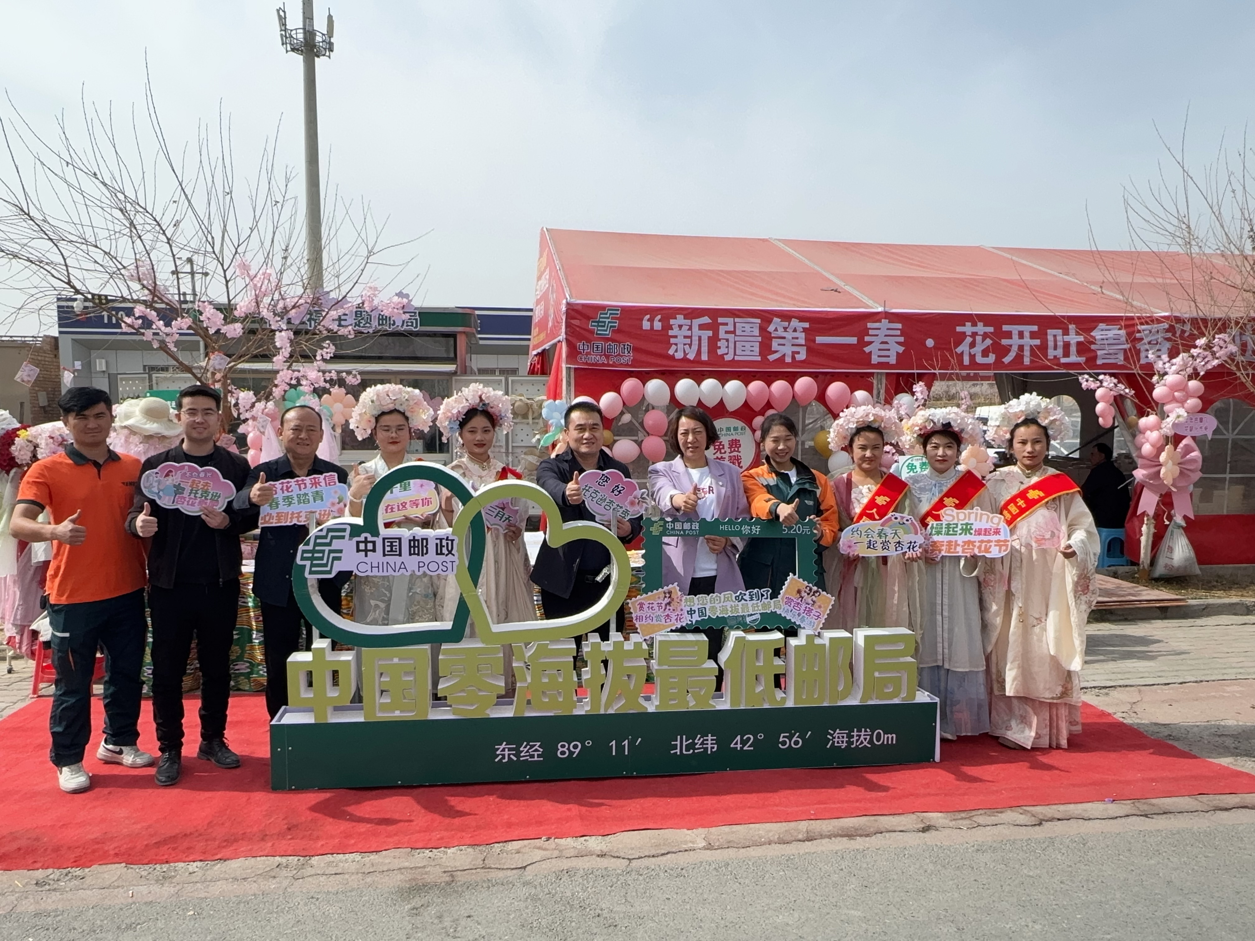 3月22日,“新疆第一春·花開吐魯番”2025杏花節(jié)現(xiàn)場的“杏”福主題郵局前,游客和工作人員合影留念。吉宏燕攝