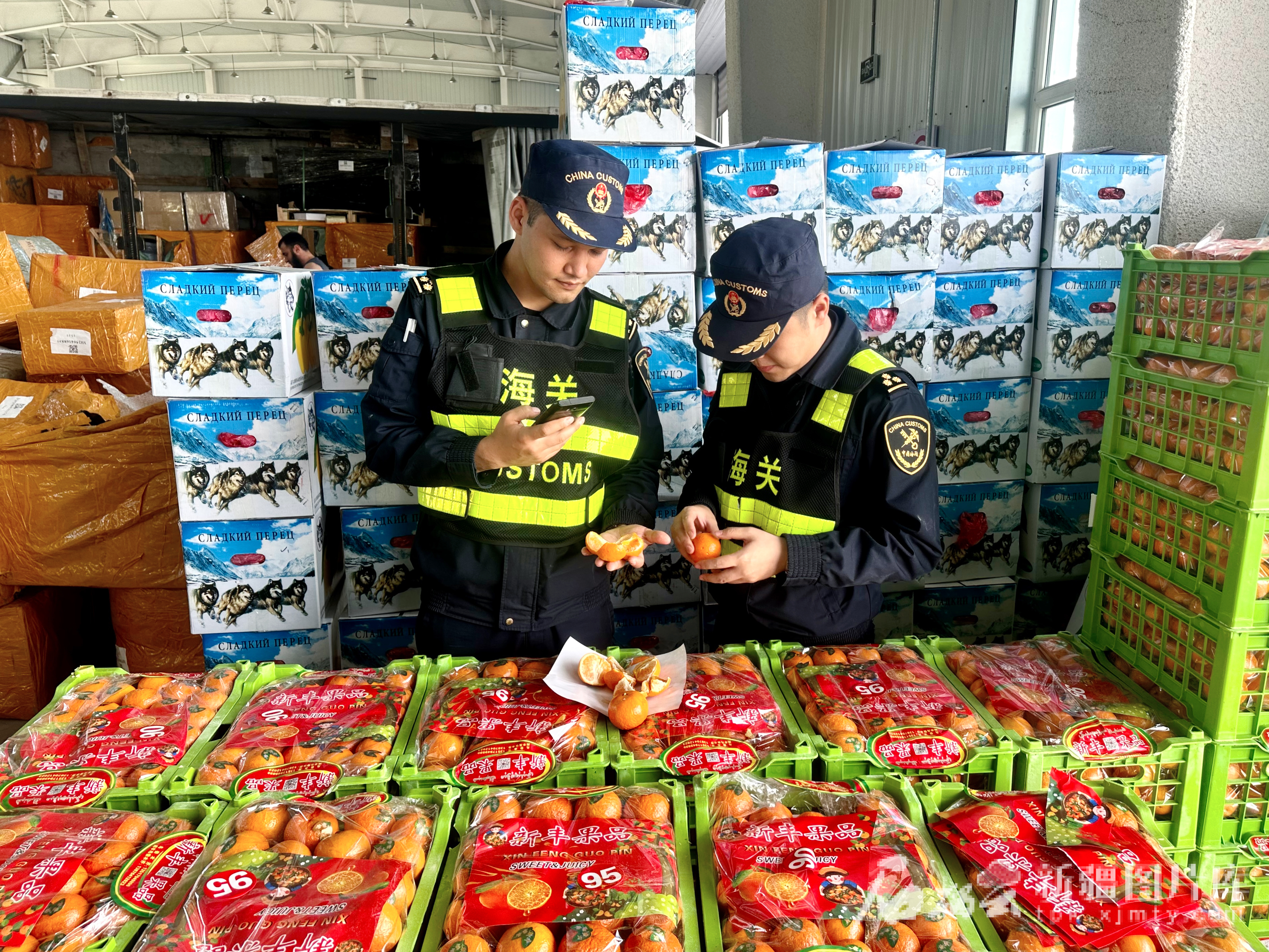 6月28日,霍爾果斯海關(guān)關(guān)員對(duì)出口柑橘進(jìn)行查驗(yàn)。趙啟龍 攝