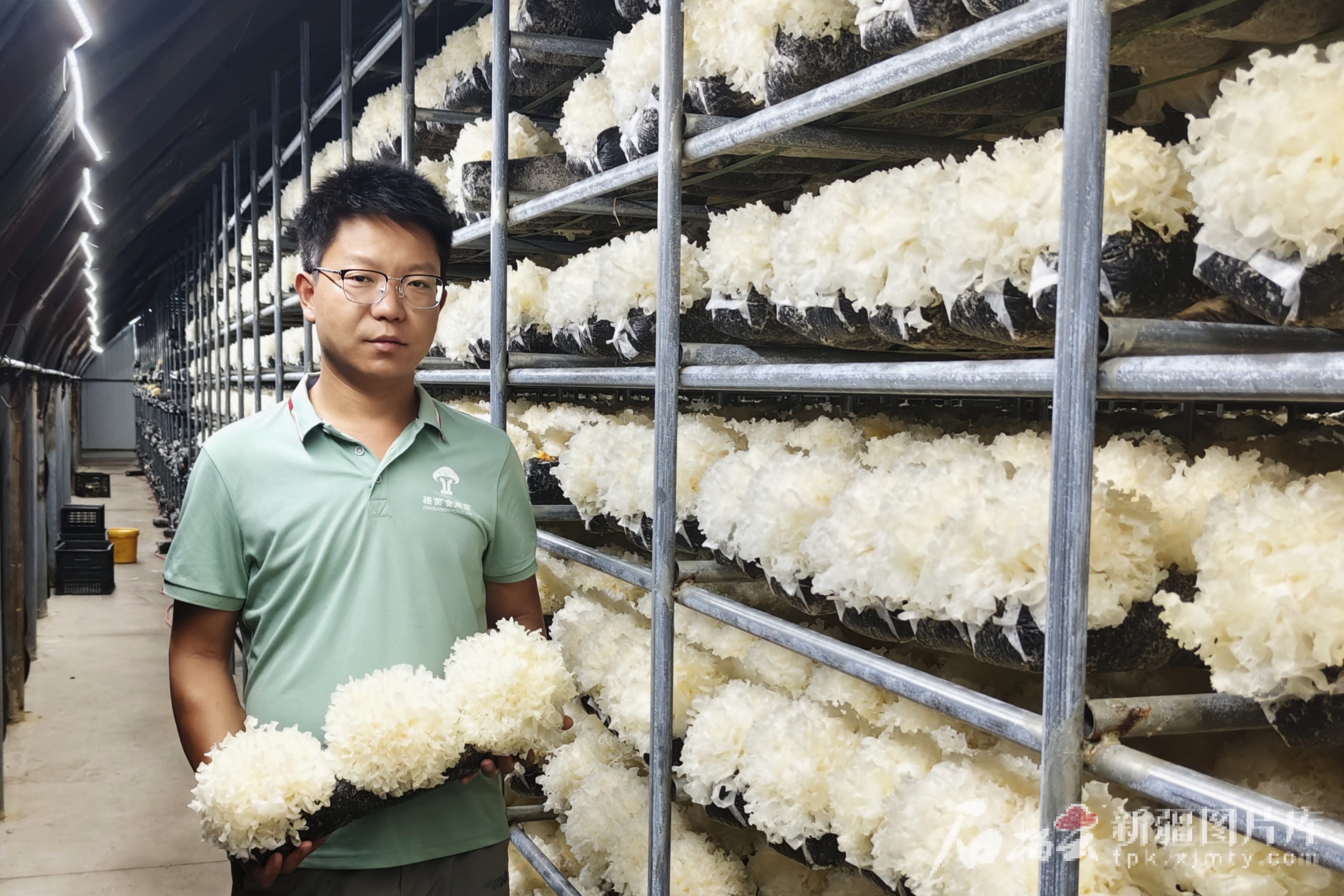 7月22日,在和靜縣疆菌食用菌專業(yè)合作社的智能恒溫棚,該合作社理事長(zhǎng)周波展示他種植的銀耳。夏歡攝