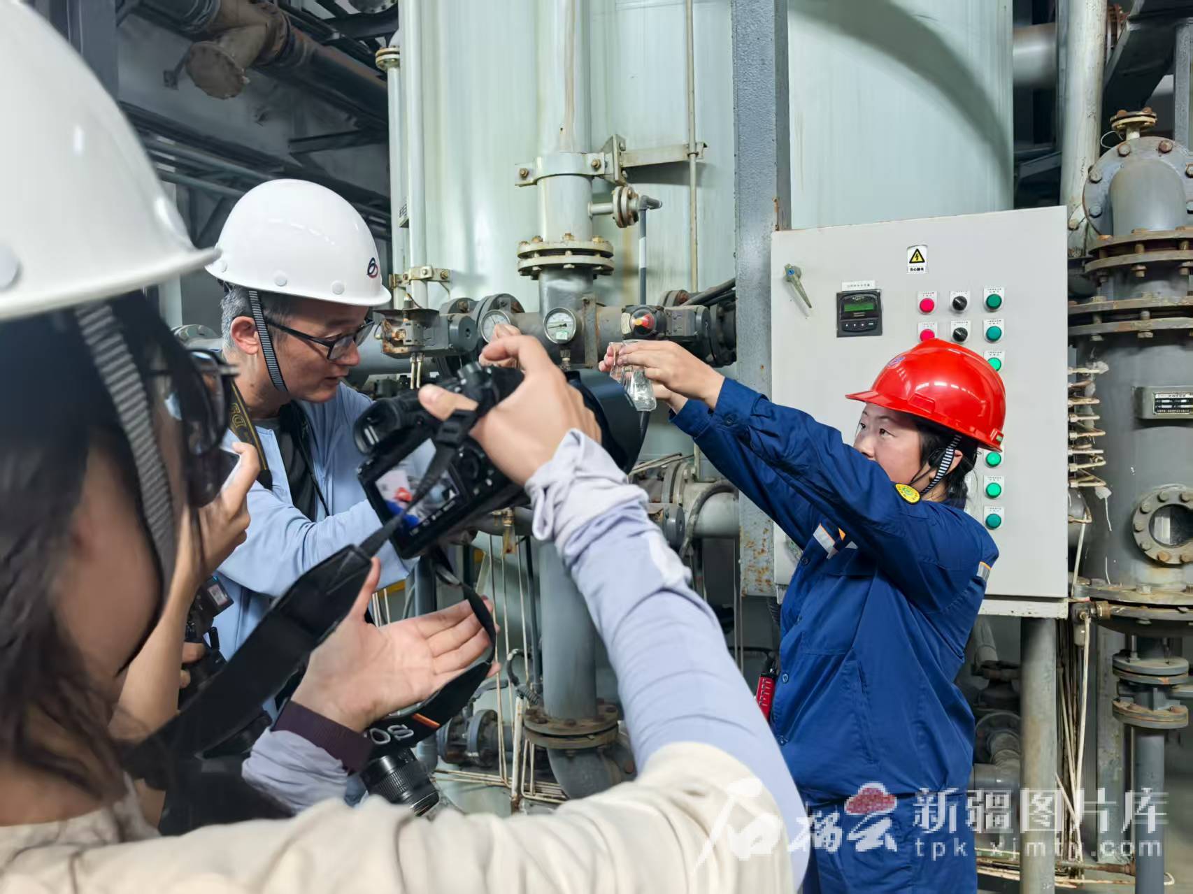 8月9日,新疆八一鋼鐵集團有限公司互力佳源環(huán)??萍加邢薰緩U水作業(yè)區(qū),化驗員樊曉云(右一)向采訪團展示兩杯處理后的再生水。天山網(wǎng)-新疆日報記者 王昕攝