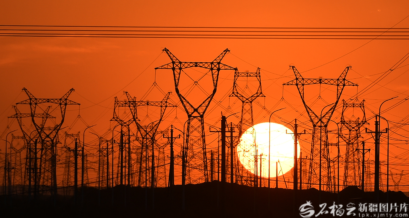9月9日,夕陽(yáng)下昌吉—古泉±1100千伏特高壓直流輸電工程昌吉換流站外的輸電線路。