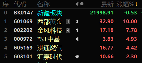 10月13日新疆板塊股價(jià)漲幅排名(來源:東方財(cái)富)。