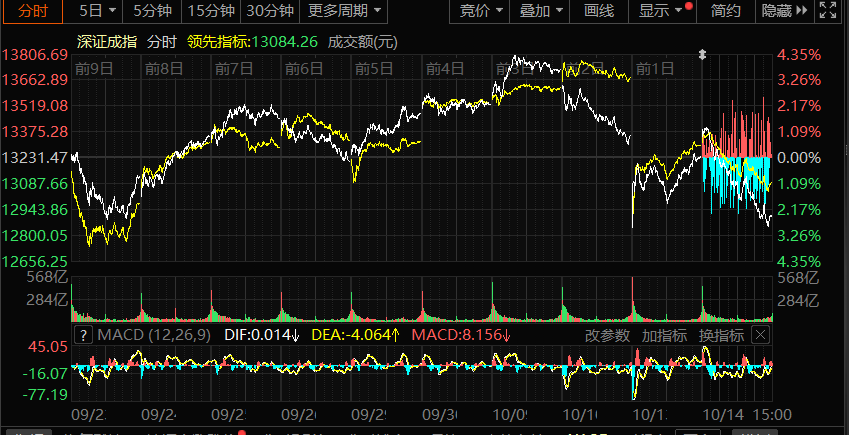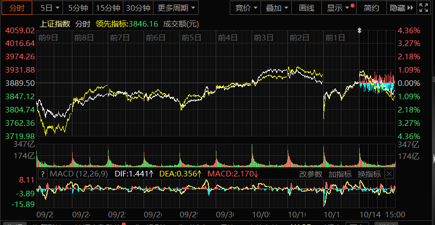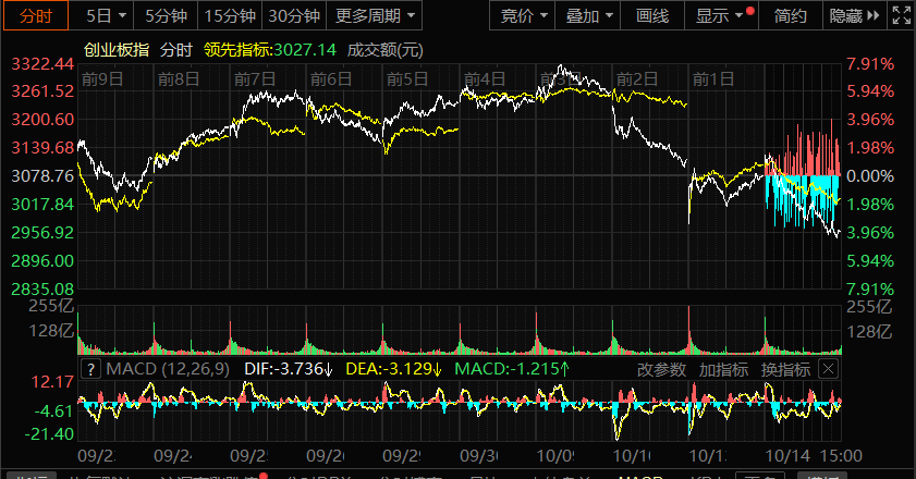 天山網-新疆日報訊(記者王永飛報道)10月14日,A股三大指數集體回調,截至收盤,滬指跌0.62%,報收3865.23點;深證成指跌2.54%,報收12895.11點;創(chuàng)業(yè)板指跌3.99%,報收2955.98點。滬深兩市成交額達到25762億元,較昨日放量2215億元。