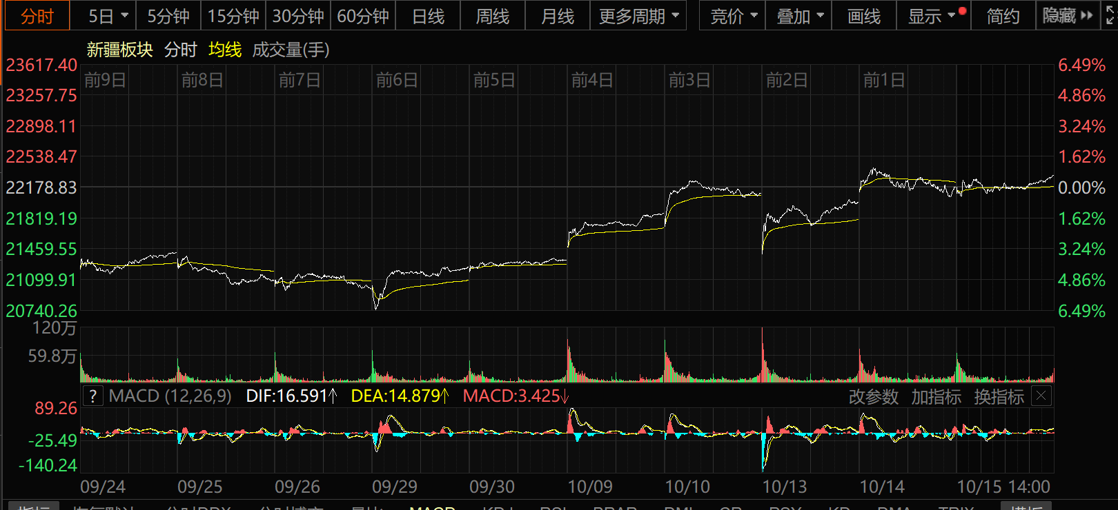 10月15日收盤時,新疆板塊指數(shù)漲0.62%,報收22315.47點,40只股票上漲,20只股票下跌,1只股票平盤,個股上漲比例為65.57%,總換手率2.37%,總成交額290.13億元。