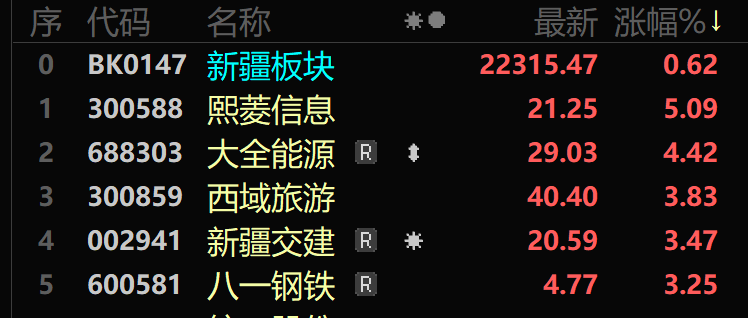 今日,熙菱信息上漲5.09%,報收21.25元;大全能源上漲4.42%,報收29.03元;西域旅游上漲3.83%,報收40.40元;新疆交建上漲3.47%,報收20.59元;八一鋼鐵上漲3.25%,報收4.77元。洪通燃?xì)?、科力股份、中油資本、東方環(huán)宇、*ST中基跌幅居前。