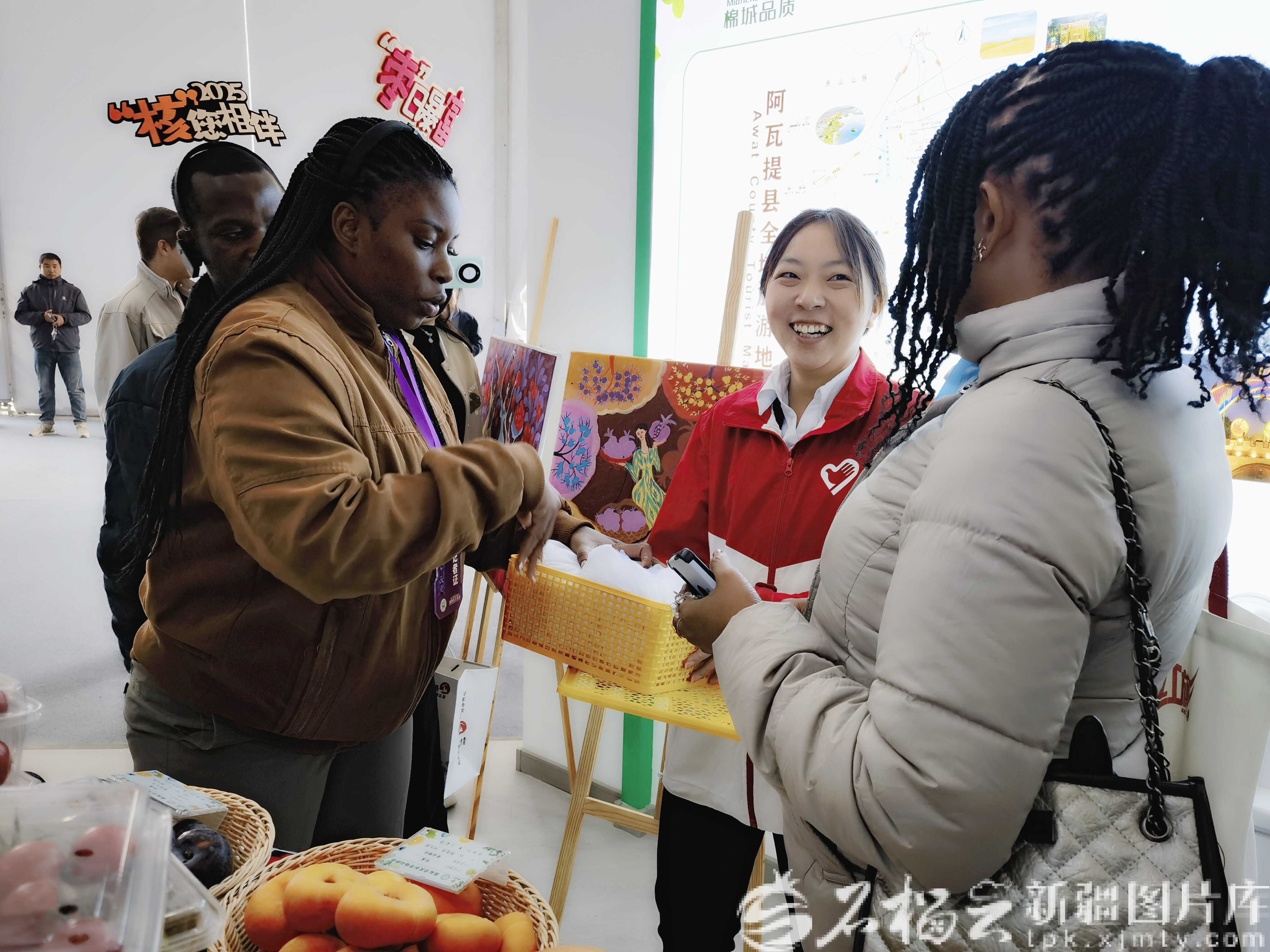 10月17日,第十一屆新疆特色果品(阿克蘇)交易會上,外國客商在購買蘋果。天山網(wǎng)-新疆日報記者 陳疆林攝