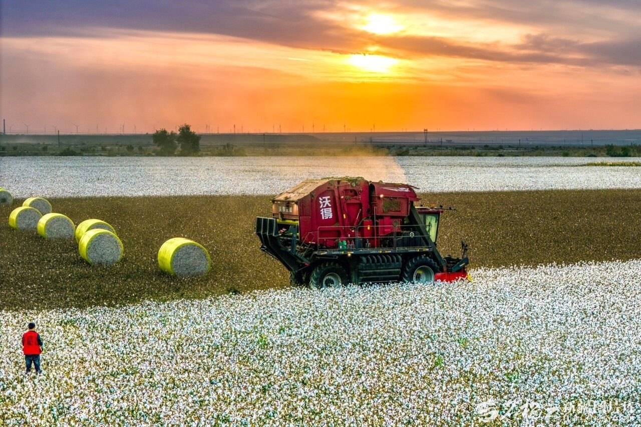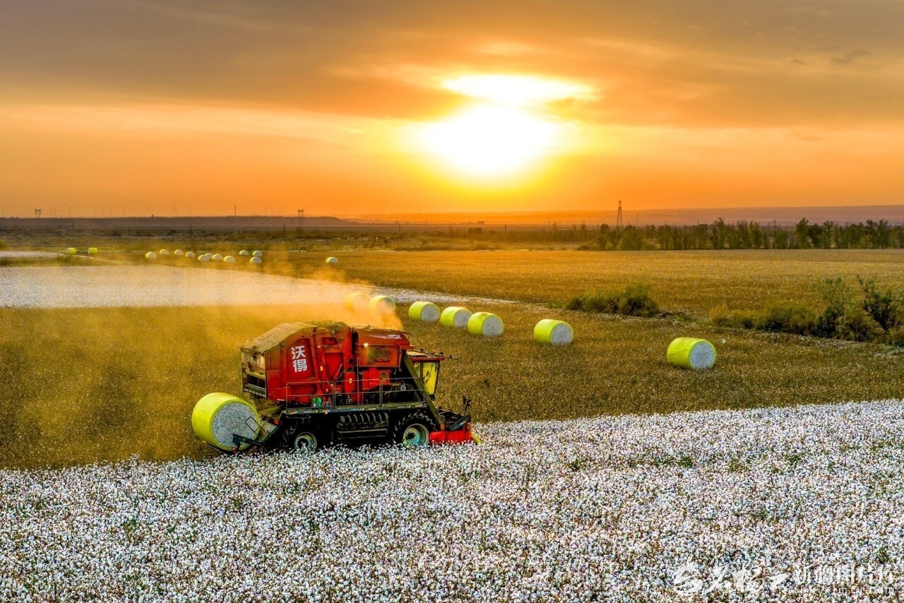 10月12日,大型采棉機(jī)在克拉瑪依市農(nóng)業(yè)綜合開發(fā)區(qū)棉田來回穿梭,將采收的棉花打包成一個(gè)個(gè)形同巨蛋的棉包。該市持續(xù)優(yōu)化種植布局,推動(dòng)棉花等經(jīng)濟(jì)作物向優(yōu)勢(shì)區(qū)域聚集。今年,當(dāng)?shù)毓卜N植棉花30萬畝,目前已進(jìn)入大采收尾期,預(yù)計(jì)總產(chǎn)量超13萬噸。閔勇攝