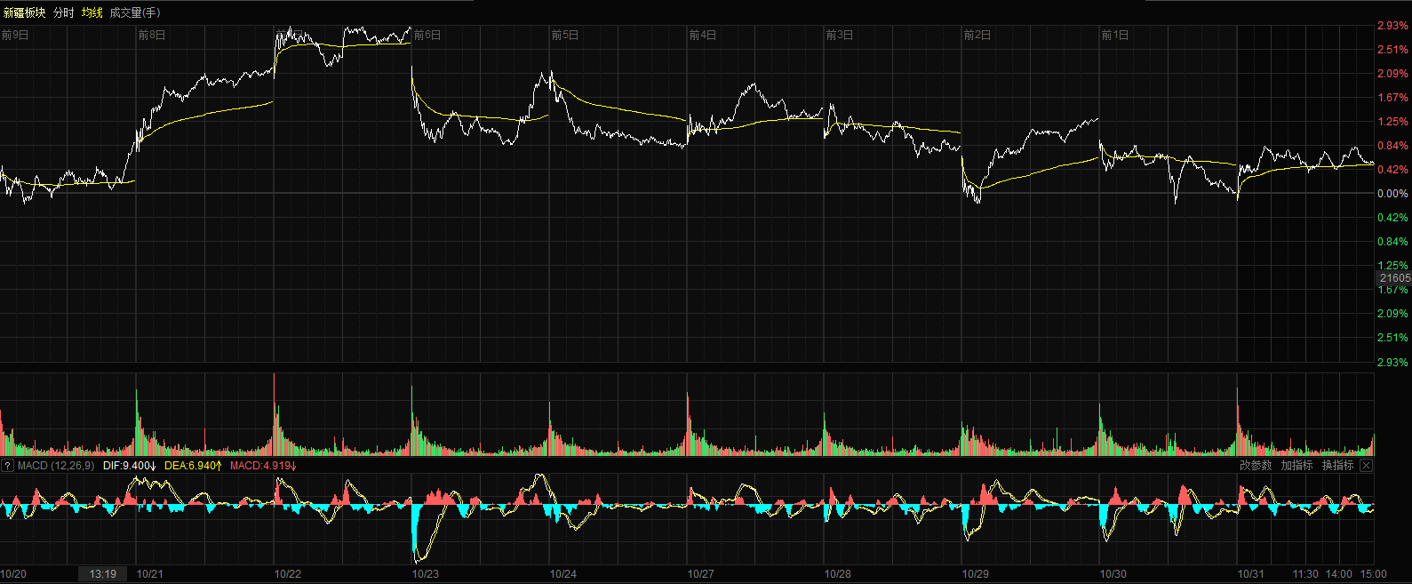 10月31日收盤時,新疆板塊指數(shù)漲0.50%,報收22070.34點(diǎn),40只股票上漲,21只股票下跌,個股上漲比例為65.57%,總換手率1.93%,總成交額227.62億元。