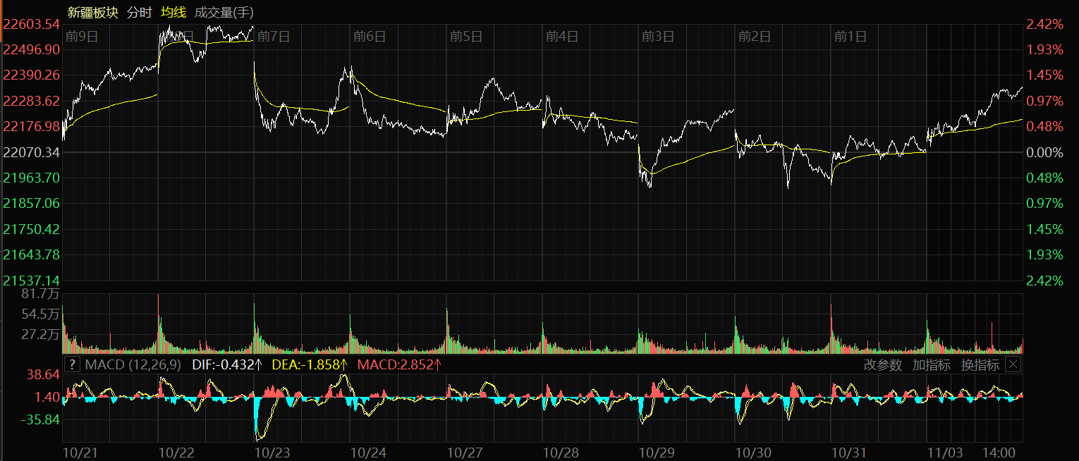 11月3日收盤時(shí),新疆板塊指數(shù)漲1.25%,報(bào)收22346.78點(diǎn),49只股票上漲,9只股票下跌,3只股票平盤,個(gè)股上漲比例為80.33%,總換手率1.91%,總成交額249.27億元。